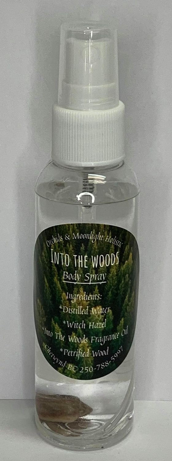 This spray is made with the 'Into the Woods' fragrance blend and infused with a petrified wood crystal.